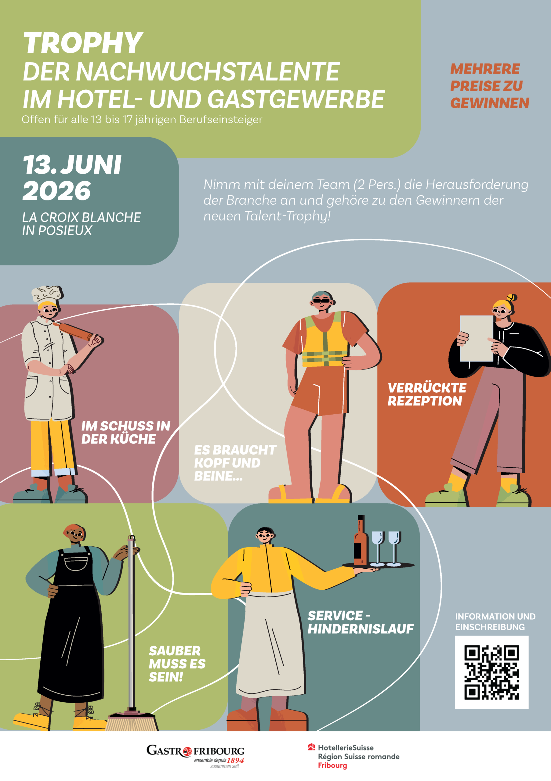 Der Wettbewerb "Trophée des Nouveaux Talents de l'Hôtellerie-Restauration" findet am Samstag, dem 13. Juni 2026, in Posieux statt